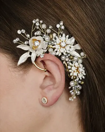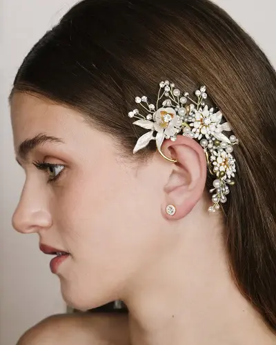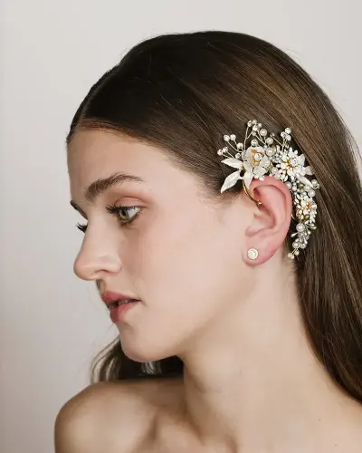 Accesorio de novia moderna o de invitada para su colocación en pelo suelto y también en recogido de novia como una trenza, un semirecogido, moño, coleta e incluso con el pelo corto.