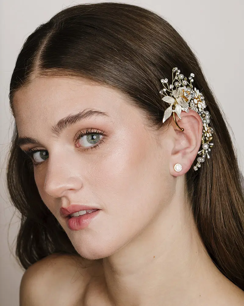Pendiente trepador ear cuff dorado de novia o invitada con piedras strass, alambradas con hilo de metal dorado. En las foto está combinado con las peinetas IMAGINE, con los pendientes de botón IMAGINE y con los pendientes de botón PIN.